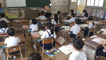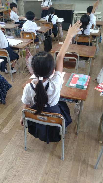 1年生が国語の単元「はなしたいなききたいな」の学習で、報告したいことをみんなの前で話したり、友達の話を聞いて感想を述べたりする学習に取り組んでいます。子どもたちは夏休みの楽しかった思い出を発表したり質問したりしています。