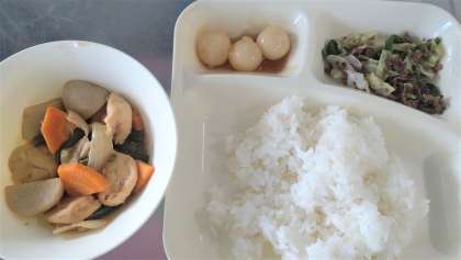 今日の給食には、「一口がんもとさといものみそ煮」と「みたらしだんご」がでます。