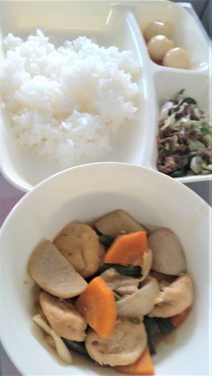 今日の給食は、一口がんもとさといものみそ煮、牛肉と野菜のいためもの、みたらしだんご、ごはん、牛乳です。