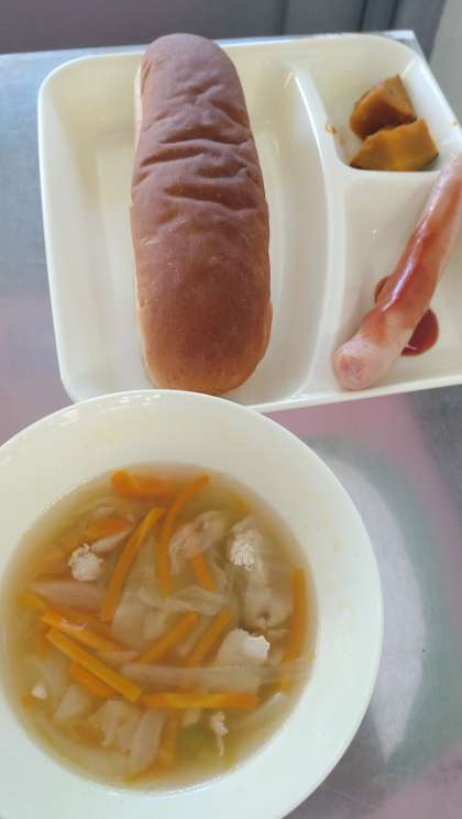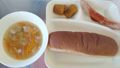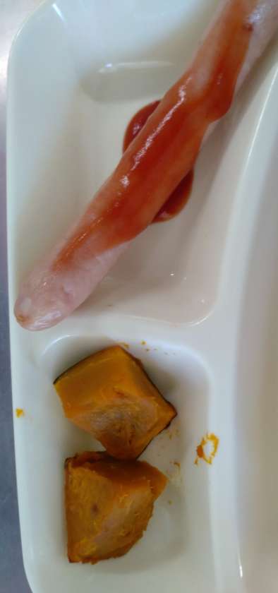 今日の給食は、ウインナーのケチャップソース、スープ、焼きかぼちゃ、黒糖パン、牛乳です。