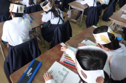 そして、みんなで葉っぱのかんむりをかぶって「見つけたよカード」を書きました。