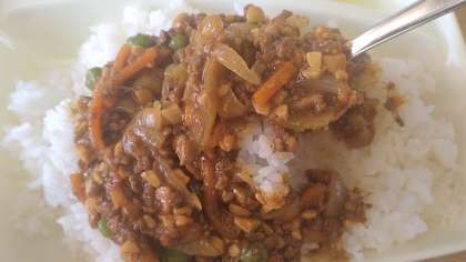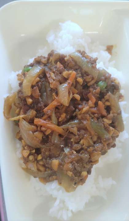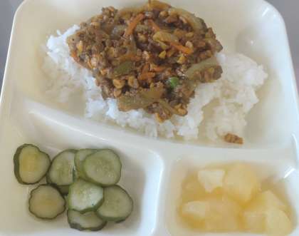 今日の給食は、大豆入りキーマカレーライス🍛、きゅうりのサラダ🥒、洋なし(カット缶)🍐です。