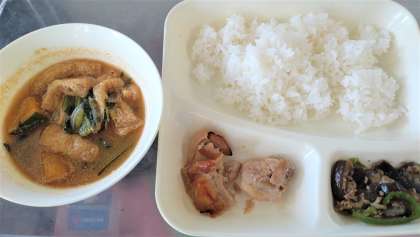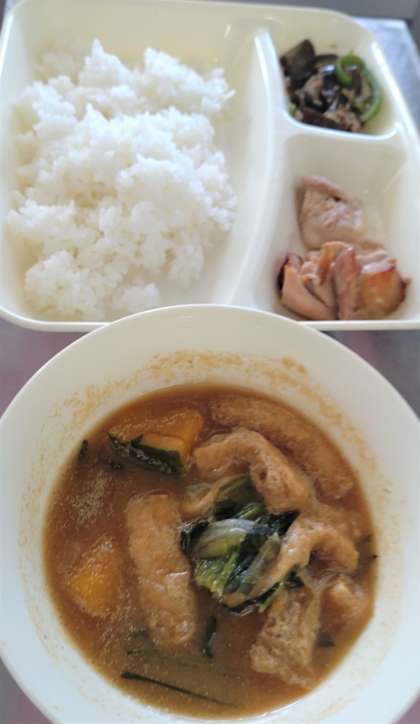 今日の給食は、鶏肉のてり焼き、かぼちゃのみそ汁、なすのそぼろいため🍆、ごはん🍚、牛乳🥛です。