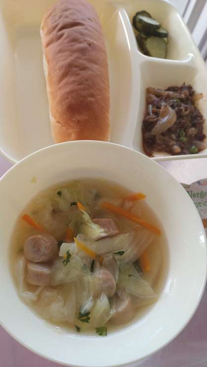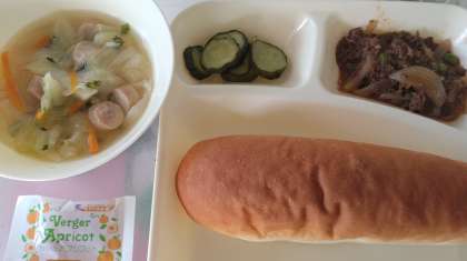 今日の給食は、牛肉のソース煮🐂、スープ、きゅうりのピクルス🥒、アプリコットジャム、牛乳🥛です。