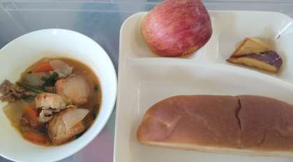 今日の給食は、中華煮、大学いも🍠、りんご🍎、黒糖パン🍞、牛乳🥛です。
