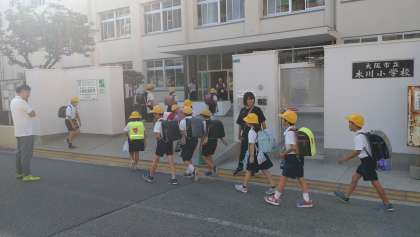 写真は、8時15分頃の登校時間をしっかりと守って元気登校する子どもたちの様子です。