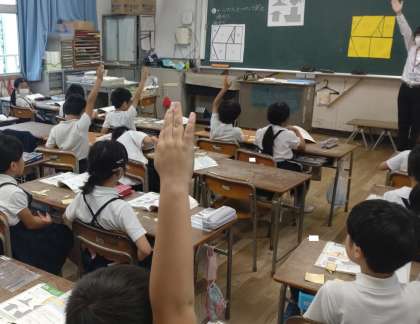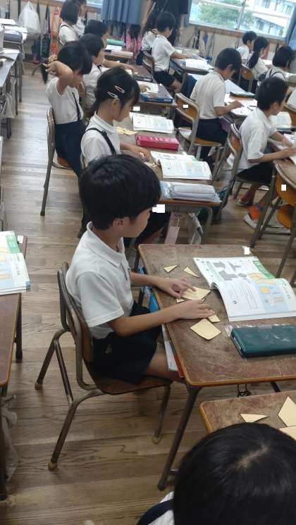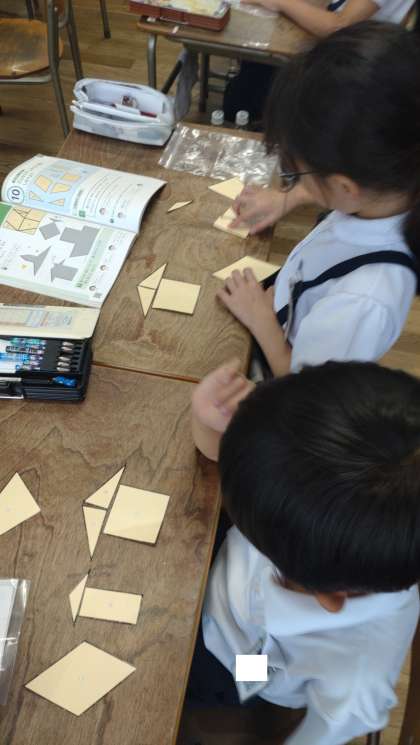2年生が算数で図形の学習に取り組んでいます。今日は、教育実習生の授業があり、大学の先生も来て授業が行われました。パズルを使い、いろいろな形を作り、それらの形について話し合いをしました。また、平面図形に親しむとともに、三角や四角の形について調べました。子どもたちは熱心に学習に取り組んでいました。