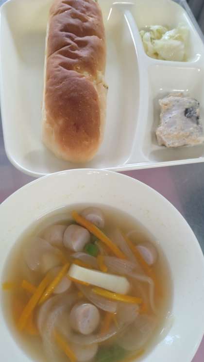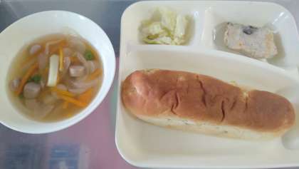 今日の給食は、かつおのガーリックマリネ焼き、ウインナーとじゃがいも🥔のスープ、キャベツのサラダ、おさつパン、牛乳🥛です。