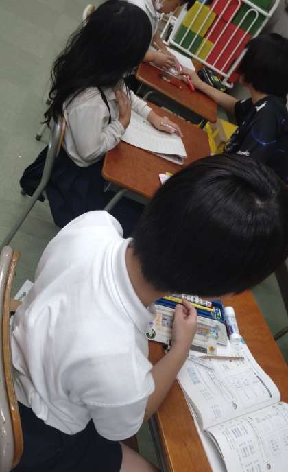 なかよし学級で国語や算数の学習に取り組んでいます。国語では物語文の読み取り、算数は、かけ算のひっ算など、それぞれの課題に集中して取り組んでいます。