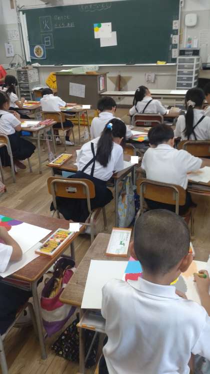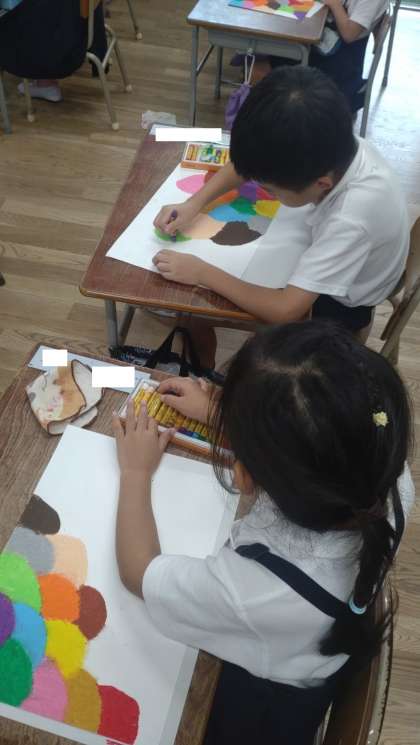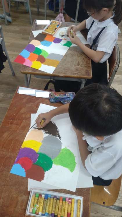 1年生が図画工作で、描画に取り組んでいます。とても丁寧に彩色しています。
