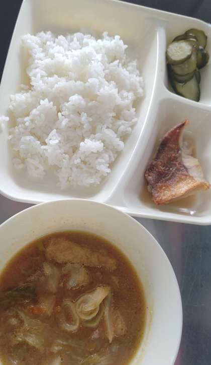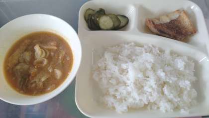 今日の給食は、あかうおのしょうゆだれかけ🐡、豚汁🐖、きゅうりのゆず風味🥒、ごはん🍚、牛乳🥛です。