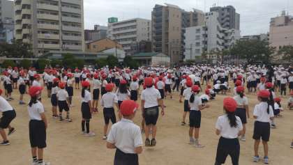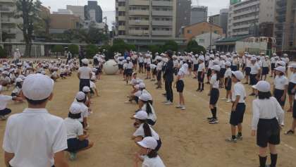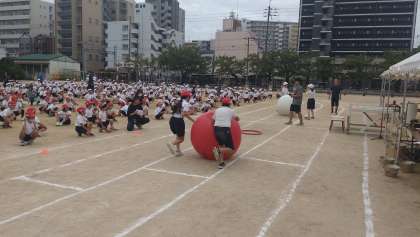 本年度の運動会では、子どもたち全員でする全体競技「大玉おくり」もプロクラムに加わりました。写真は、全体練習での競技の様子です。