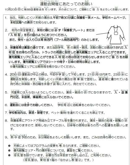 運動会(10月20日)についてのお願い(再掲)