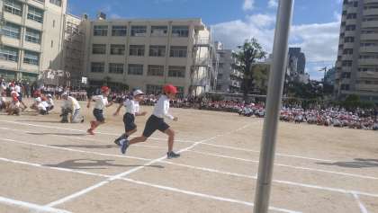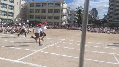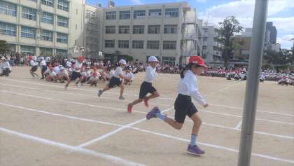 写真は、3年生の個人走の様子です。タイトルのとおり、子どもたちは全力でダッシュしていました。