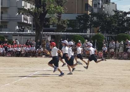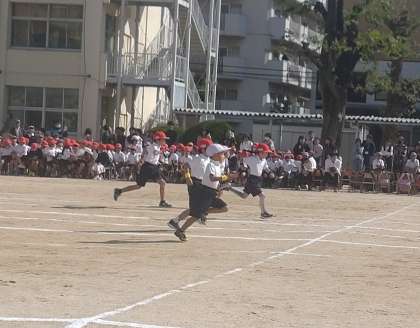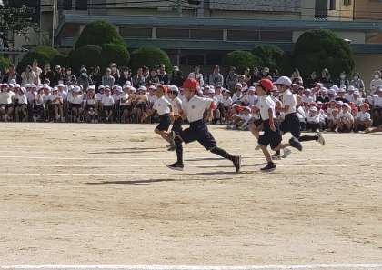 1年生にとって小学校生活はじめての運動会です。個人走では、子どもたちはゴールに向かって一生懸命に走っていました。
