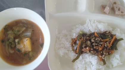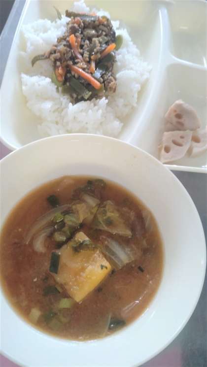 今日の給食は、もずくとひき肉のジューシー、さつまいも🍠のみそ汁、焼きれんこん、牛乳🥛です。