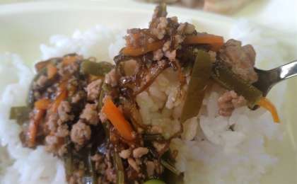 給食のジューシーは、豚ひき肉、にんじん、むきえだまめ、もずく、切りこんぶなどを使った、たきこみご飯風です。ご飯と具を混ぜて食べましょう。