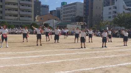 4年生の団体演技は、エイサー踊りでした。息の合ったパーランクー(太鼓)の音と子どもたちのかけ声が運動場に響いていました。演技中は沖縄の風がグランドに吹いているようでした。