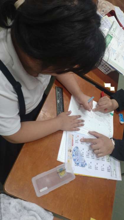なかよし学級で、子どもたちがそれぞれの課題に向けて頑張っています。漢字や算数の小数のひっ算の計算など、わからない点を先生に質問しながら課題を解決しています。