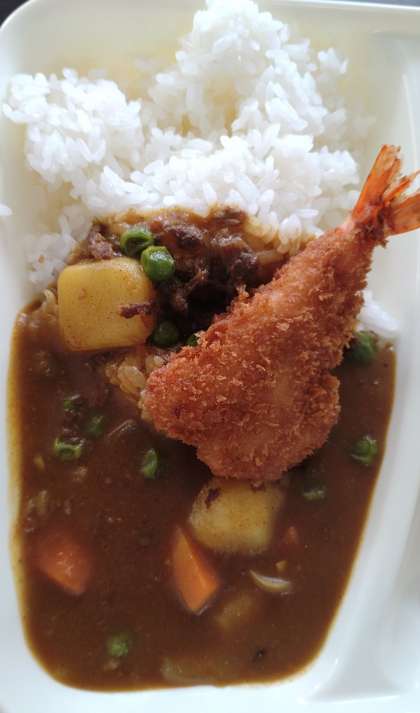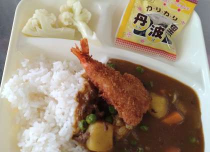 今日の給食は、えび🦐フライカレーライス🍛、カリフラワーのピクルス、いり黒豆、牛乳🥛です。