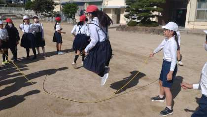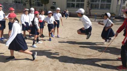 今日もなわとび週間で、子どもたちは学級で力を合せて長縄運動に熱心に取り組んでいます。