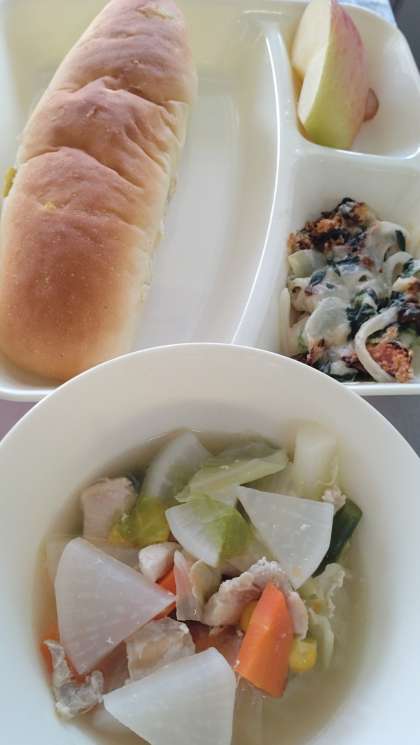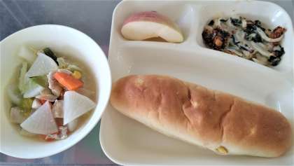 今日の給食は、ほうれんそうのグラタン、スープ煮、りんご🍎、おさつパン🍞、牛乳🥛です。