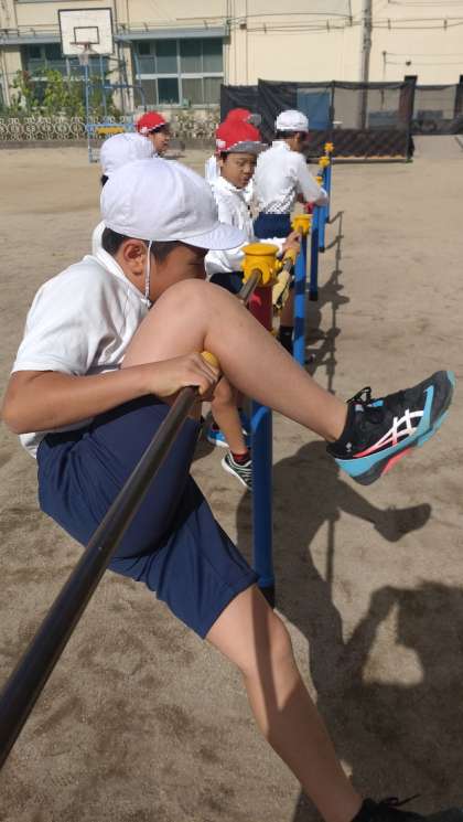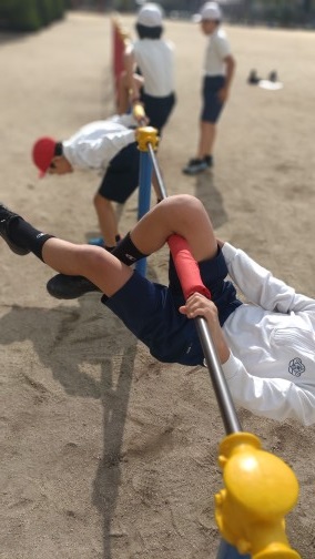 5年生が体育で器械運動の鉄棒運動に取り組んでいます。鉄棒運動では、支持系の基本的な技を安定して行ったり、その発展技を行ったり、それらを繰り返したり組み合わせたりすることができるように取り組んでいます。