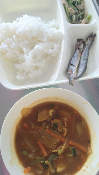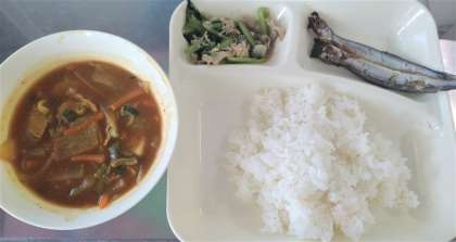 今日の給食は、焼きししゃも🐟、さといもの和風カレー汁、ささみとこまつなのいためもの、ごはん🍚、牛乳🥛です。