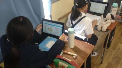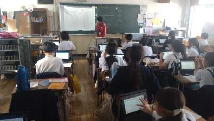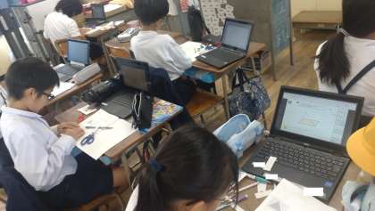 5年生が算数で面積の求め方について学習しています。三角形の性質に着目し、三角形の面積の求め方を一人一台端末PCなどを活用して考えています。