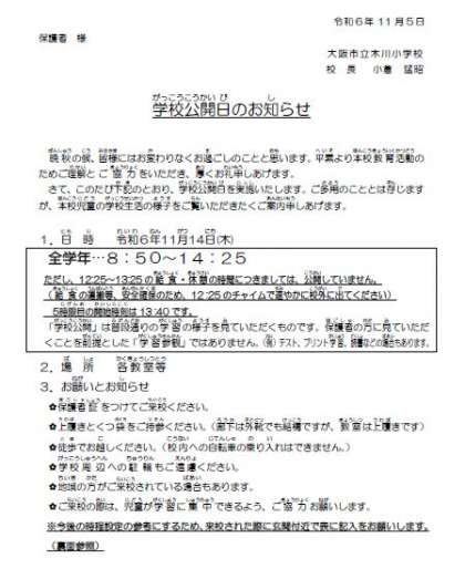 下記に以前配布しました学校公開日案内を再々掲いたします。