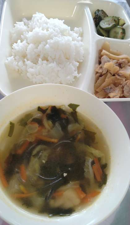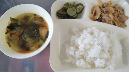 今日の給食は、豚肉🐖のコチジャンいため、鶏肉🐔とはるさめのスープ、きゅうり🥒のナムル、ごはん🍚、牛乳🥛です。