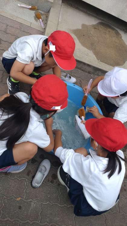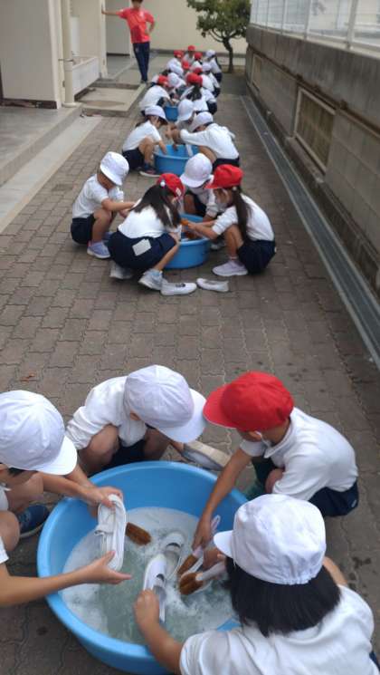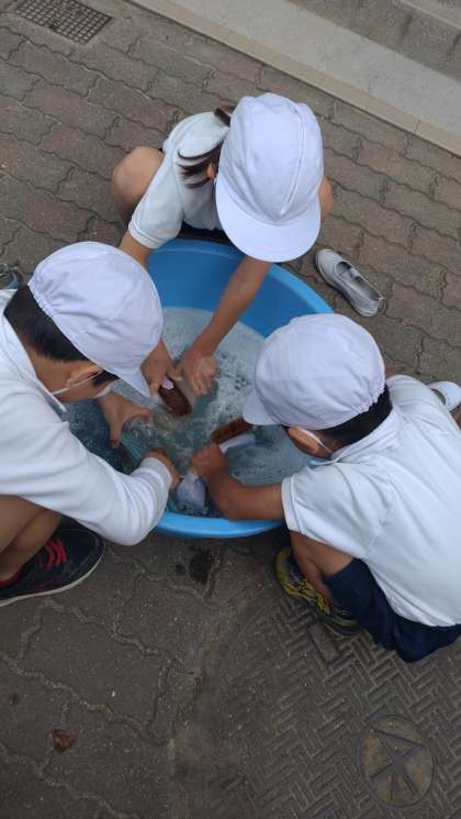 1年生が生活科で上靴洗いをしました。家庭生活を振り返り、自分でできることを体験する学習です。