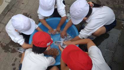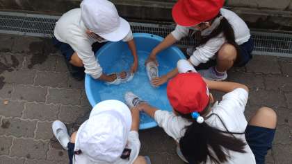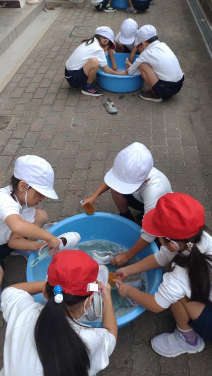 子どもたちは、とても熱心に自分の上靴を洗っていました。洗い終わって、すすぎも丁寧に取り組んでいます。