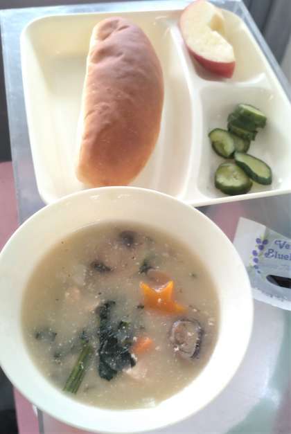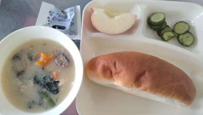 今日の給食は、鶏肉🐔ときのこ🍄のシチュー、きゅうり🥒のピクルス、りんご🍎、コッペパン、ブルーベリー🍇ジャム、牛乳🥛です。