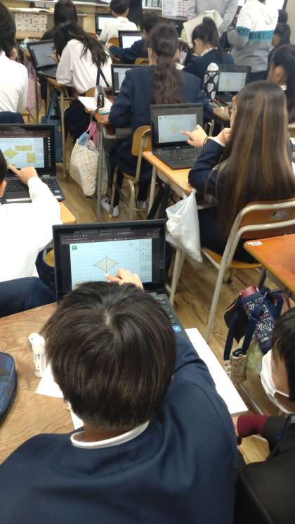 本日、教育委員会より講師の先生に来ていただき5年生の研究授業がありました。「ひし形の面積を求めて、公式をつくろう」という課題で子どもたちは学習しました。一人一台端末を活用して子どもたちは熱心に求積していました。