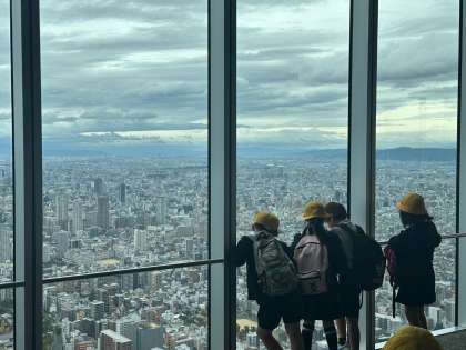 あべのハルカスの展望台から大阪市の様子を見ました。市の地形や土地利用、交通の広がり、主な公共施設の場所、建造物の分布など観察したり調べたりしています。
