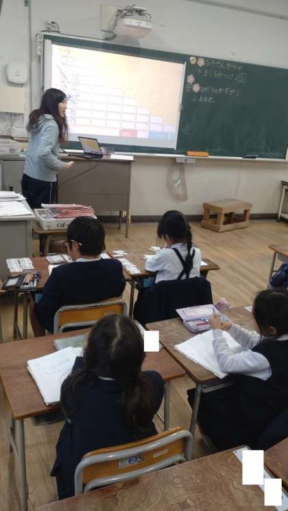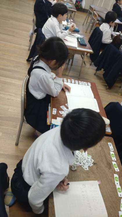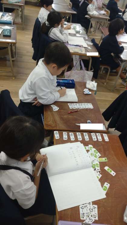 1年生が算数で、計算カードを使った学習に取り組んでいます。11〜18 から 1 位数をひく繰り下がりのあるひきざんの計算練習をしています。ひきざんの計算能力をのばす学習です。