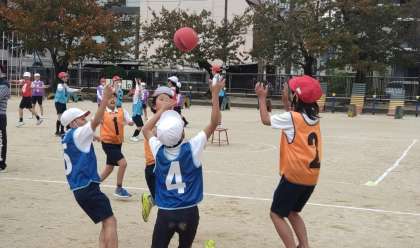 4年生が体育で、ポートボールに取り組んでいます。ポートボールは、ゴール型ゲームで、パスやドリブルでボールをつなぎ、ポートボール台の上にいる. ゴールマンにボールが渡れば得点が入るゲームです。子どもたちは、チームで声をかけあいながら熱心にプレーしていました。
