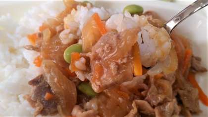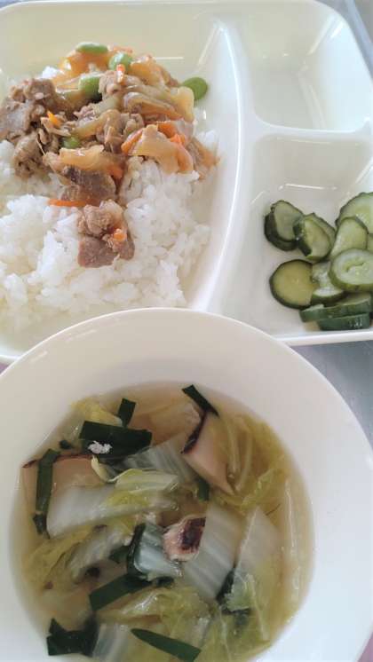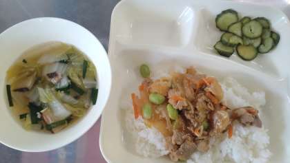 今日の給食は、ピリ辛丼、中華スープ、きゅうり🥒の甘酢づけ、牛乳🥛です。