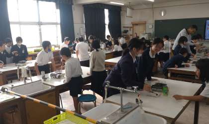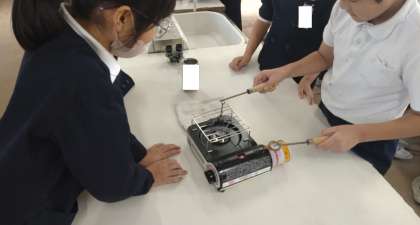 4年生が理科で、加熱器具を安全に正しく使って、金属をあたためたり冷やしたりしたときの体積の変化を調べています。グループで協力して実験に取り組んでいます。
