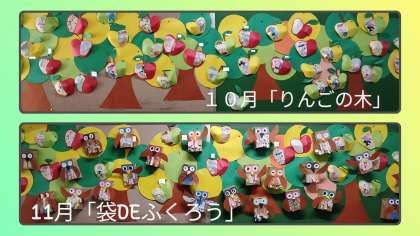 ふくろうがりんごを食べちゃったー!と子どもたちは、壁面掲示の変化に大喜びしていました。