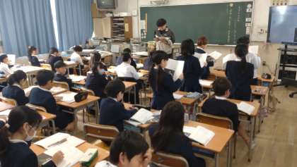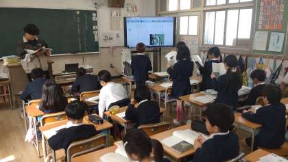 3年生が国語で物語文「モチモチの木」を学習しています。物語の登場人物について、地の文と会話文、それぞれを手がかりに想像したことを伝え合う学習です。写真は、グループで音読している様子です。