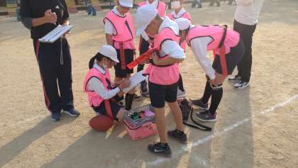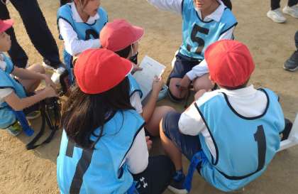 ゲームの間に、チームごとに作戦タイムで話し合いました。子どもたちは、チームの仲間たちと作戦をしっかりと考えています。