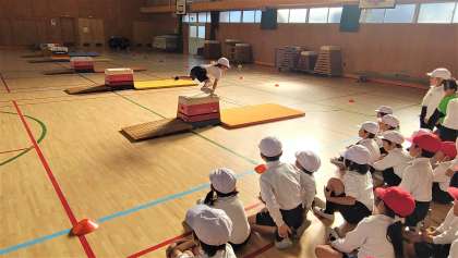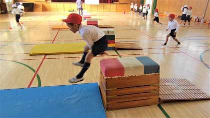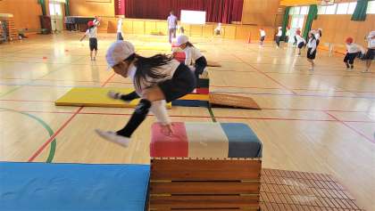 1年生が、体育で「跳び箱を使った運動遊び」に取り組んでいます。安全な遊び方を知り、いろいろな場で跳び箱を使った運動遊びをしていきます。子どもたちは、元気に運動しています。
