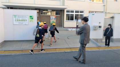 写真は、地域の子ども見守り隊の見守りの中、元気に登校する子どもたちの様子です。