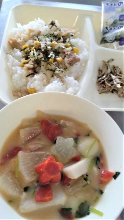 今日の給食は、れんこんのちらしずし、ぞう煮、ごまめ、牛乳🥛です。