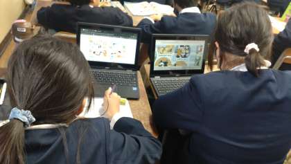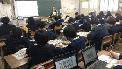 6年生が外国語の学習で将来の自分の夢について学習しています。中学校でしたいことや将来つきたい職業を伝える発表したり、文を語順に注意して英語で書いたりする学習を一人一台端末PC等を活用して取り組んでいます。