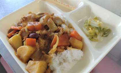 今日の給食は、豚肉🐖と金時豆のカレーライス、はくさいのピクルス、棒チーズ、牛乳🥛です。