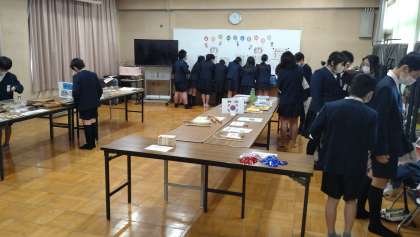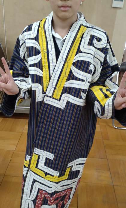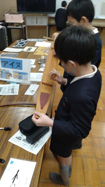 今週は「友だちの国を知ろう週間」です。多目的室にいろいろな国の民族衣装や生活用品、楽器、玩具などを展示して、直接、着たりさわったりして国際理解を深めていきます。写真は、6年生の見学の様子です。