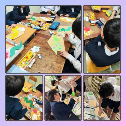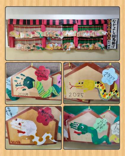 昨日、今年はじめてのなかよしタイムは、毎年恒例の絵馬を作りました。なかよし学級の子どもたちが、自分の手形をへびの顔に見立て、個性豊かなへびの絵馬ができました!一人ひとり今年の抱負を書きました。ご来校の際には、一階のなかよし学級前に展示してありますのでご覧いただければとと思います。